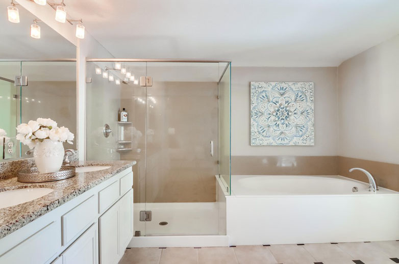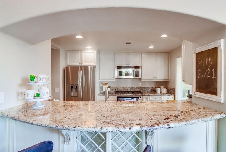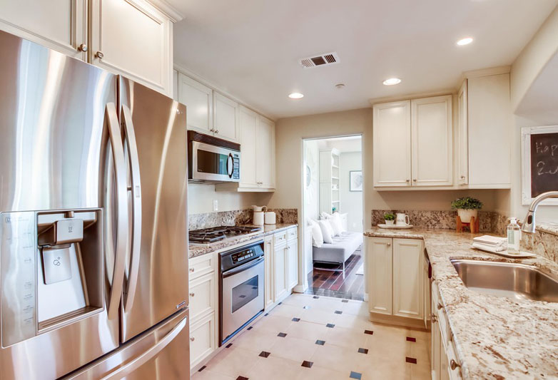 The upstairs master retreat features the highest-level of privacy with blackout blinds that operate with the push of a button, an expansive bath area with separate shower, luxurious soaking tub, double sinks, and dedicated water closet. A separate downstairs bathroom and pocket-door access from the kitchen to the den offer additional privacy and flexibility. Customized touches are evident throughout the residence with solid-core doors and mouldings, fully built-out “California Closets” walk-in with adjustable shelves in master bedroom, under-counter wine storage in living room, soft-close cabinets framing the updated kitchen with pantry and full-size laundry area, plus finished den/work-from-home office space with custom bookcases and integrated storage shelves. Additional convenience is provided by a large under-stair storage closet, two storage lockers in the garage, plus a dedicated HOA maintained bike storage area and elevator-close deeded parking spot.