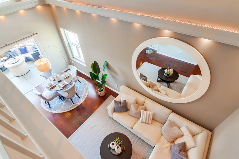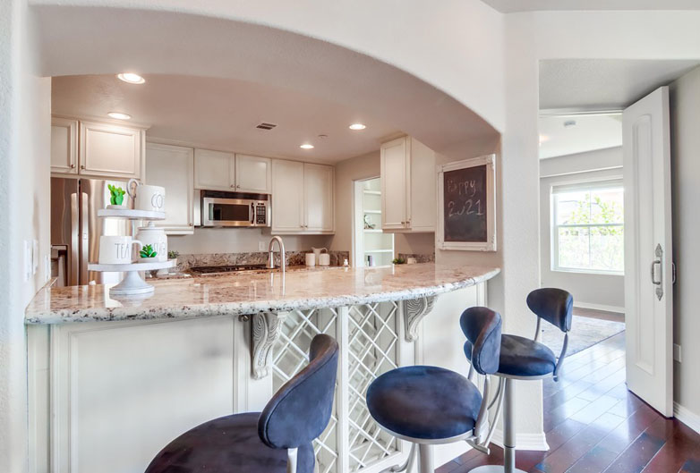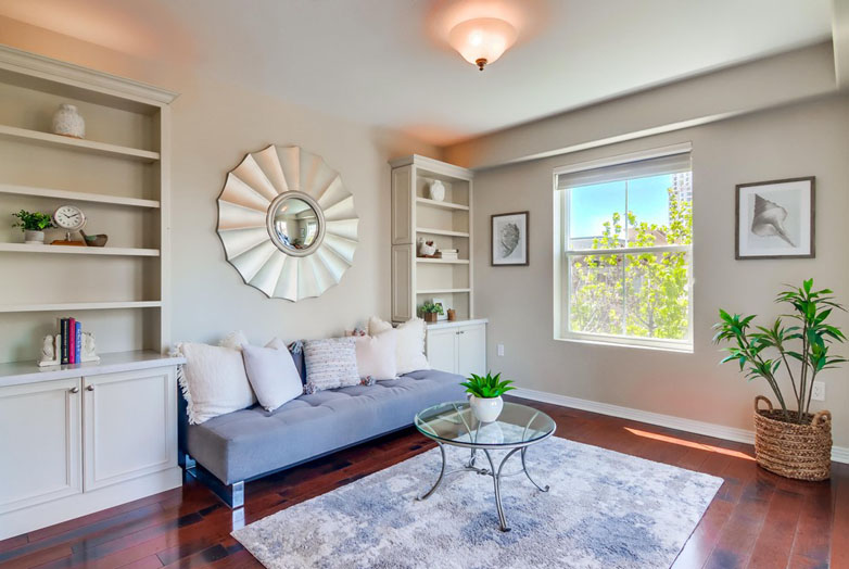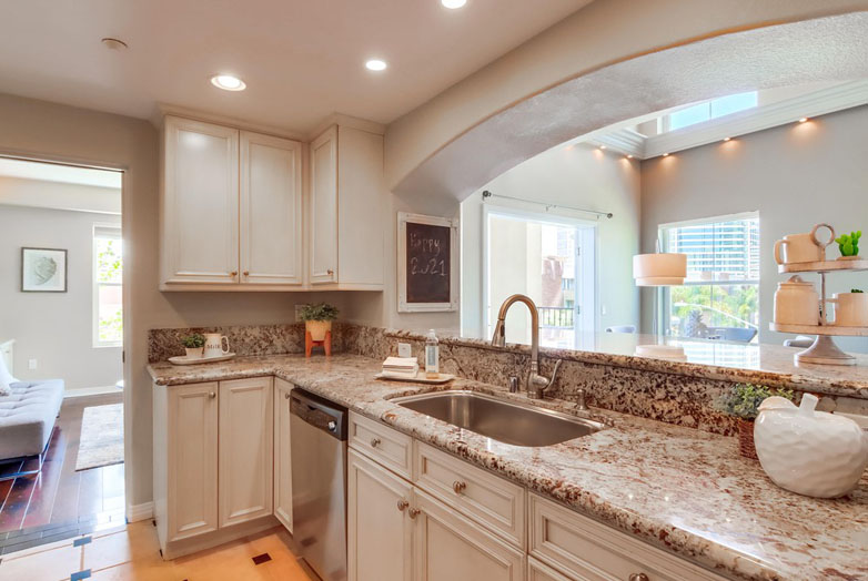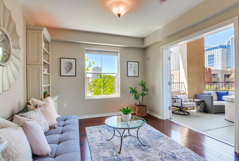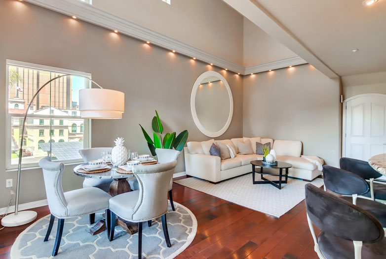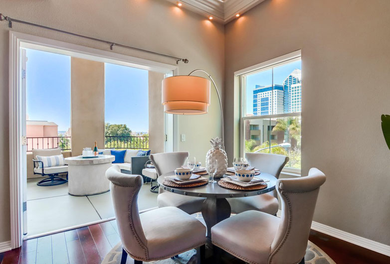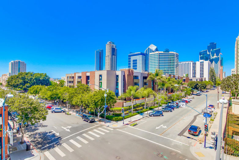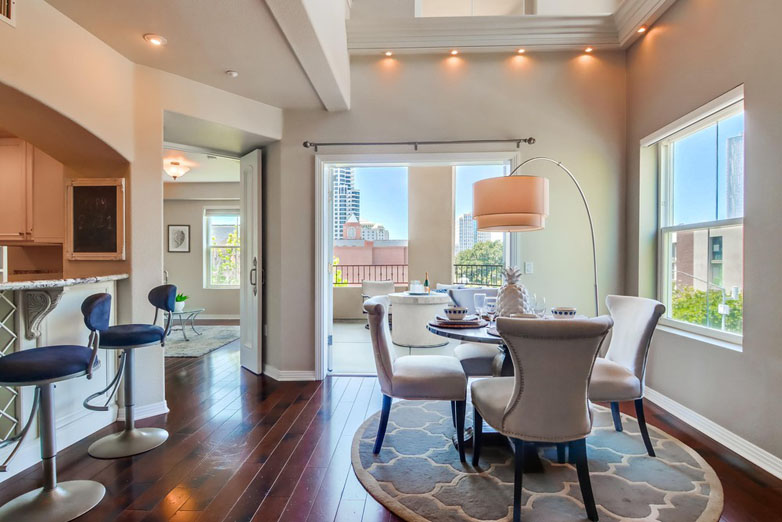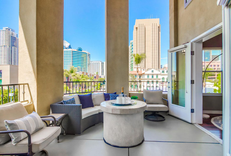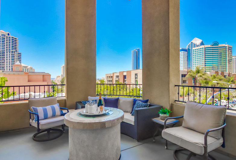 Indulge in the luxury lifestyle within San Diego’s most-desirable downtown neighborhood in this customized Marina District residence. Uniquely updated with a variety of high-end upgrades and intentional details, the rare and expansive floor plan of this stylish City Walk property allows for relaxed living with a detached home feel, while being beautifully situated within the excitement and activity of San Diego’s sophisticated urban center. With soaring double-height ceilings and peak views of San Diego Bay and the Midway entertainment complex, this residence benefits from being one of only four units with an oversized two-story covered patio, with panoramic city views and bay breezes perfect for relaxing or entertaining guests.